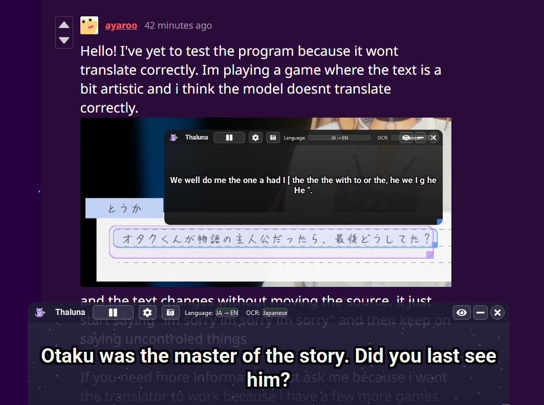 By the way, when you said it ācanāt seem to play nice with any Ollama models,ā did you mean the translations came out as nonsense, or just random characters? That info would help me a lot to confirm if OCR was the real issue.
