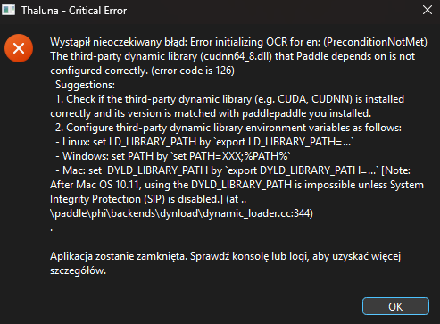 That error happens when Thaluna tries to use GPU acceleration (PaddleOCR-GPU) but CUDA/cuDNN isn’t available on your system.